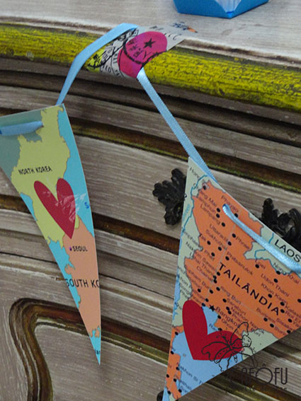 Bandeirolas para decorar a "mesa" e latinhas de leite condensadas recicladas para ajudar a decorar a mesa!